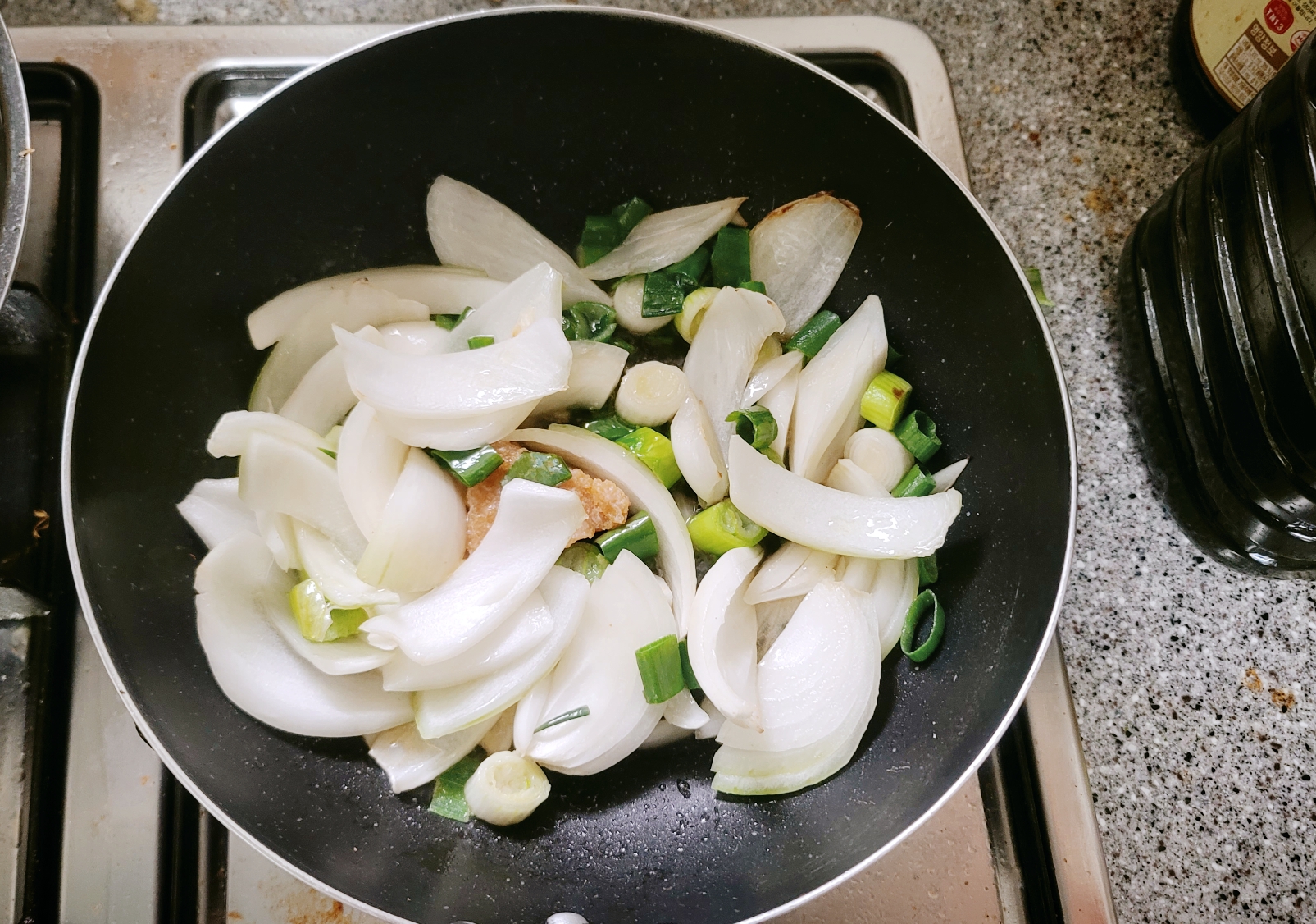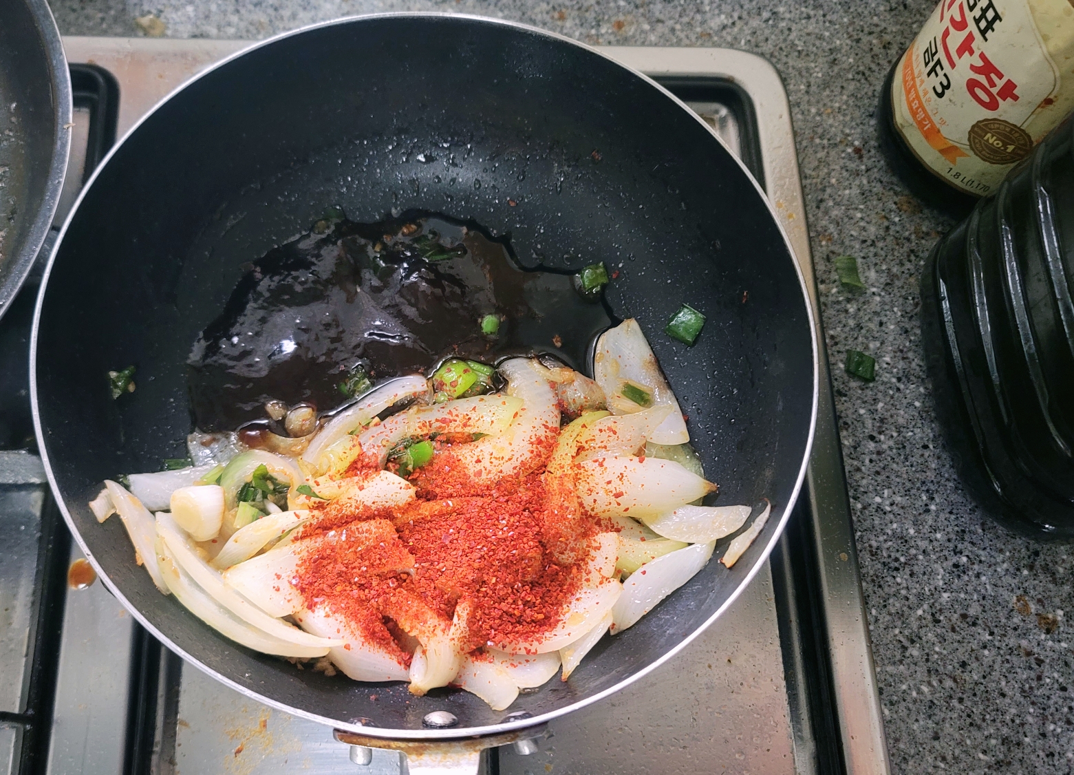 4. 한쪽에 잠시 밀어주고 진간장 두숟갈, 굴소스 두숟갈은 바닥에 넣어 주고 고춧가루 두숟갈을 양파 위에 뿌려주세요.