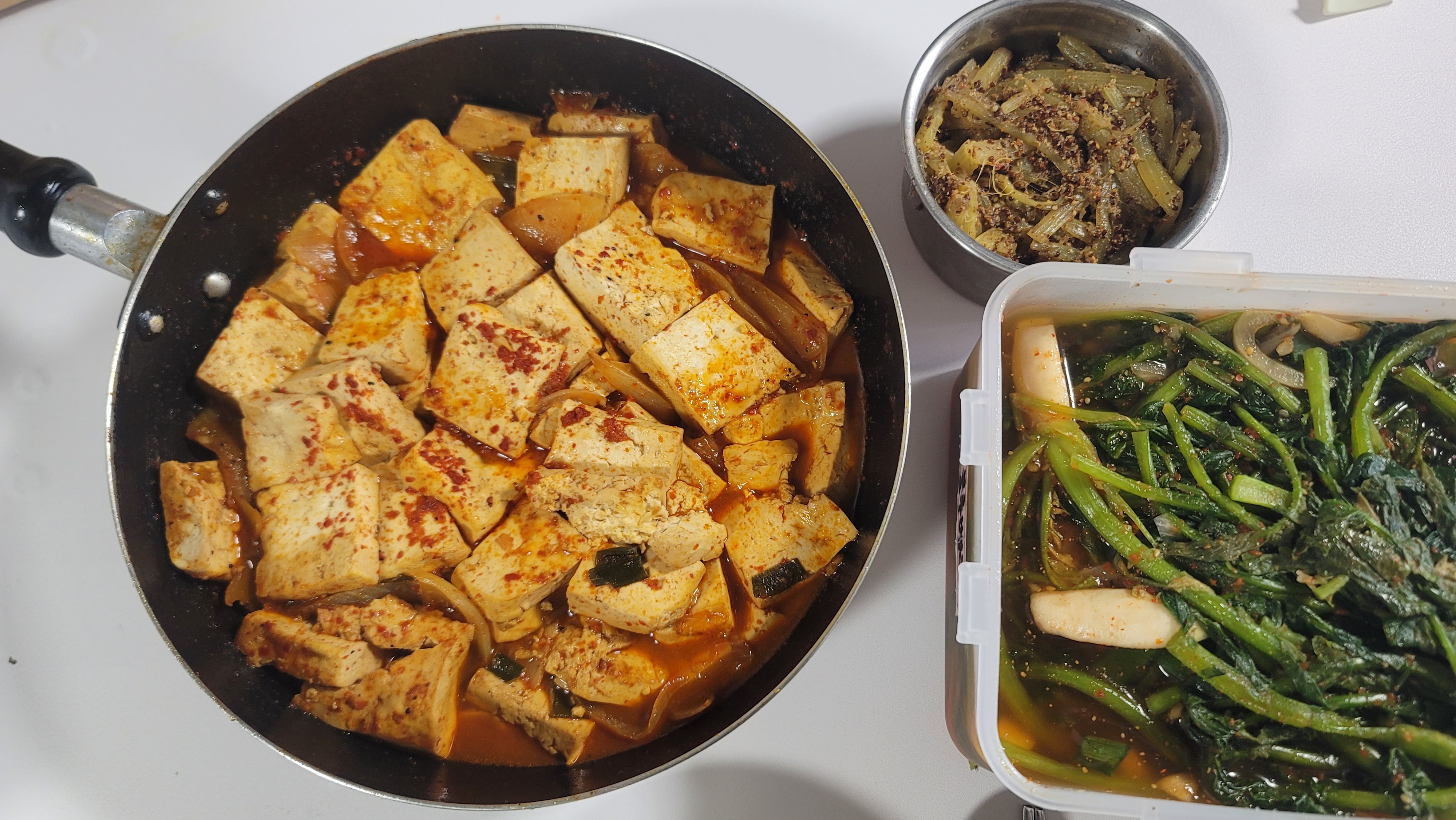 두부 한모, 양파 한개, 파 조금, 다진마늘 한숟갈,