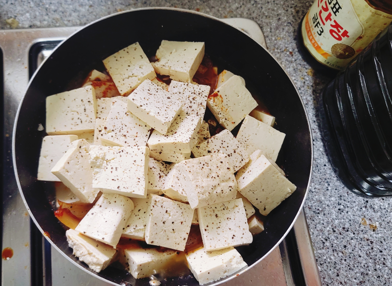 6. 나머지 두부도 다 넣고 후추를 조금 뿌려주세요.