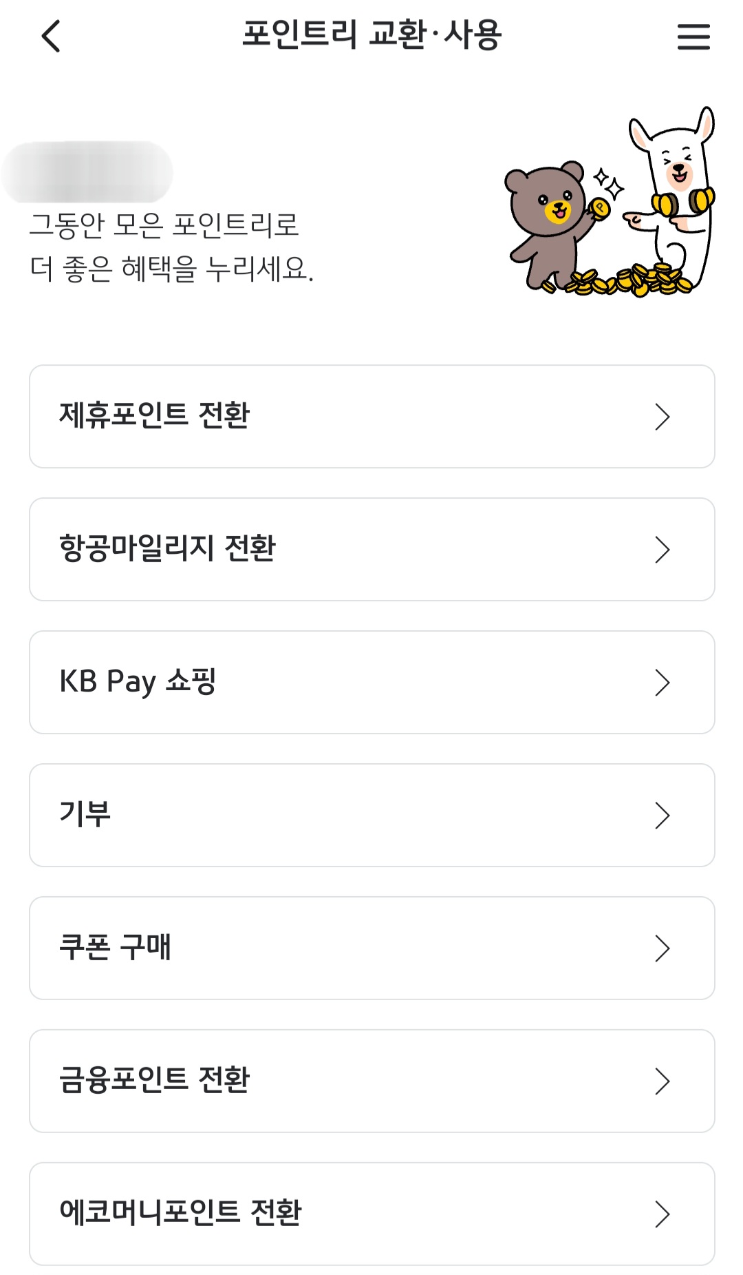 국민카드를 선택하는 창에서 포인트리를 선택해주세요. 카드가 여러개일경우에 맨앞에 포인트리가 있을거에요.