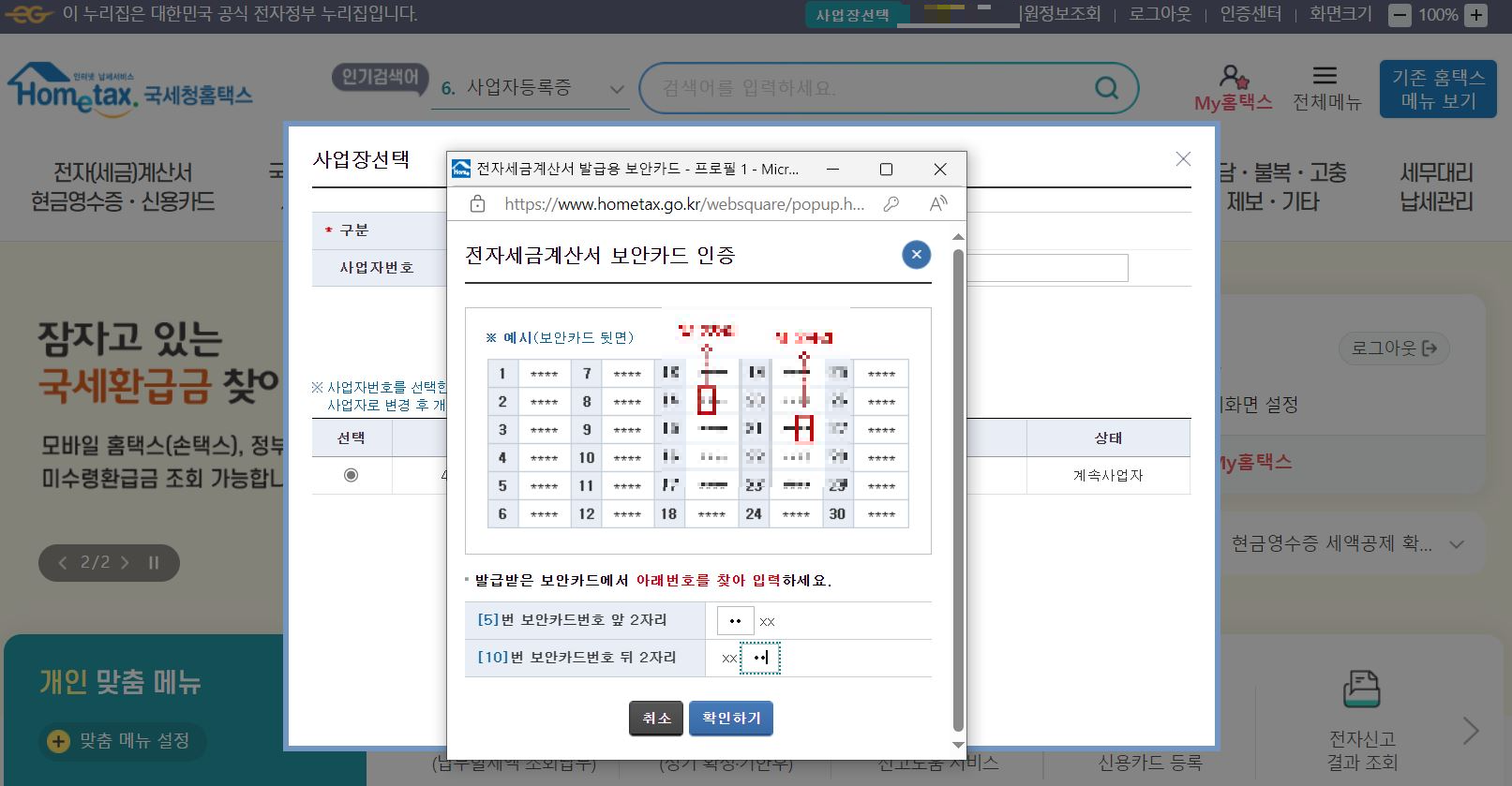 저는 사업장이 예전에 2개였어서 로그인을 하면 바로 사업장으로 연결이 안되요. 저처럼 연결이 안되시다면 로그인 후 위에 초록색으로 사업장선택이 있어요. 사업장선택을 클릭 후 원하시는 사업장으로 들어가시면 보안카드 인증 화면이 나옵니다. 하나의 사업장이시라면 로그인 후 바로 보안카드 인증화면이 나올꺼에요.