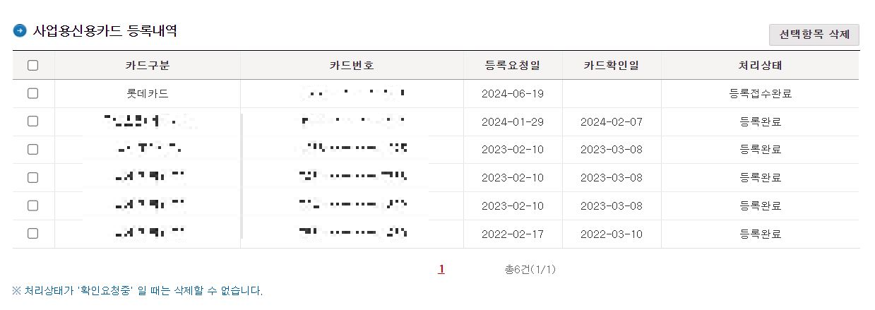 등록을 완료하면 아래 사업용신용카드 등록내역이 나옵니다. 보통 한달정도 걸리는거 같아요. 이렇게 인터넷 홈택스에서 사업용 신용카드 등록하기가 끝났습니다. 국세청 홈택스 개인 신용카드 등록하기 정말 편리해졌네요. 저는 오늘 롯데카드 개인 신용카드를 등록해보았습니다. 도움이 되셨길 바랍니다.