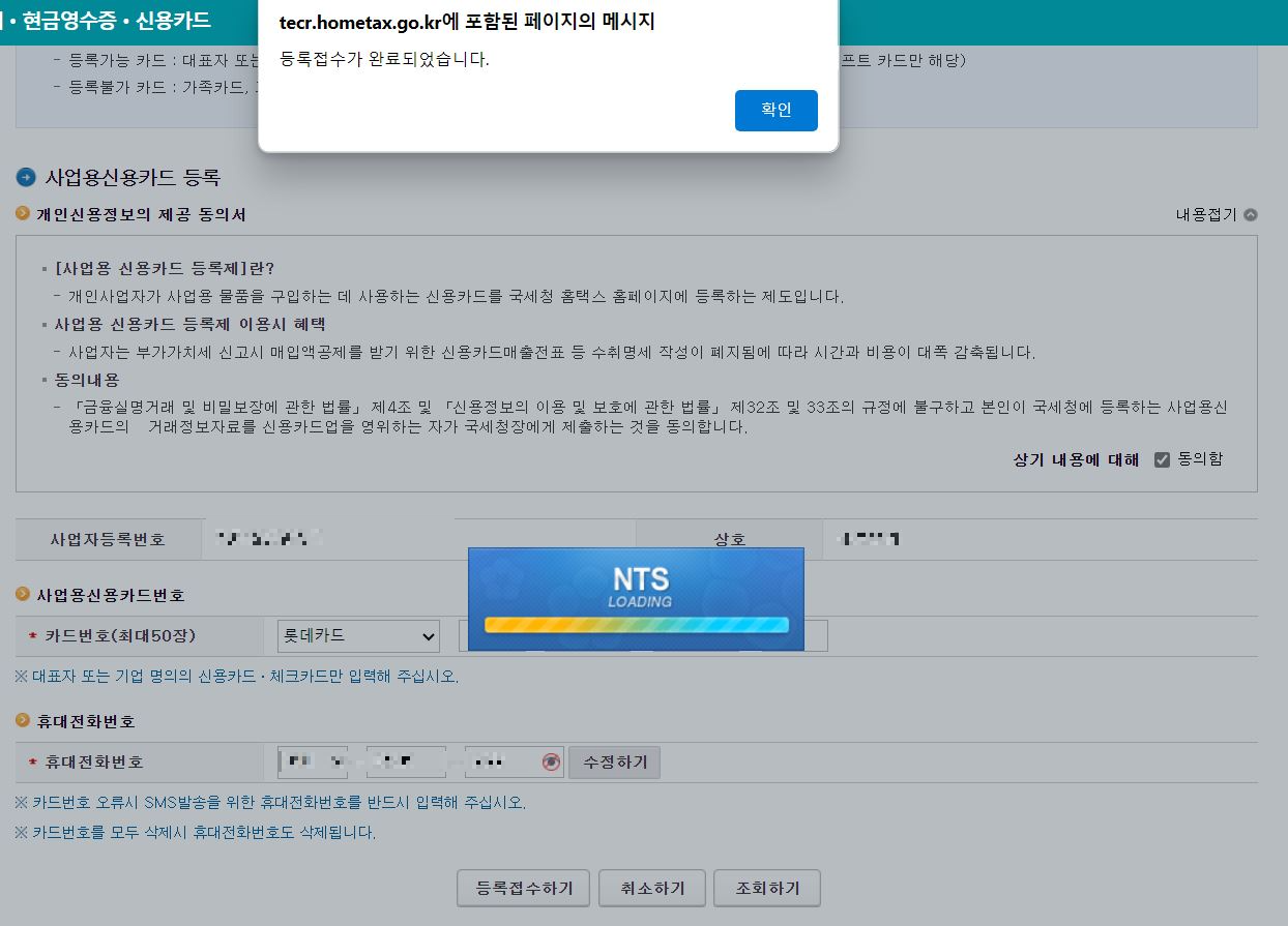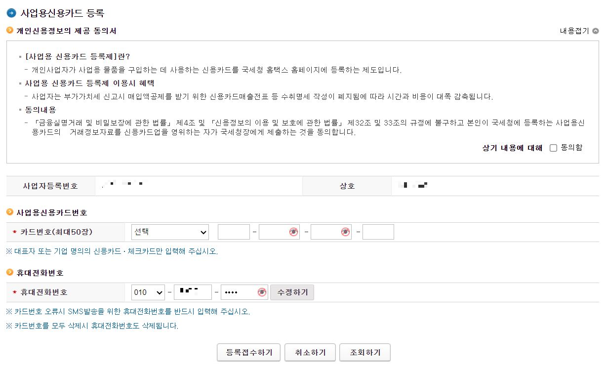 사업용 신용카드 등록화면이 나올텐데요. 사업자등록번호와 상호는 자동으로 완성되어있습니다. 위에 상기 내용에 대해 동의함 클릭해주시고 카드번호와 휴대전화번호를 입력해주세요.
