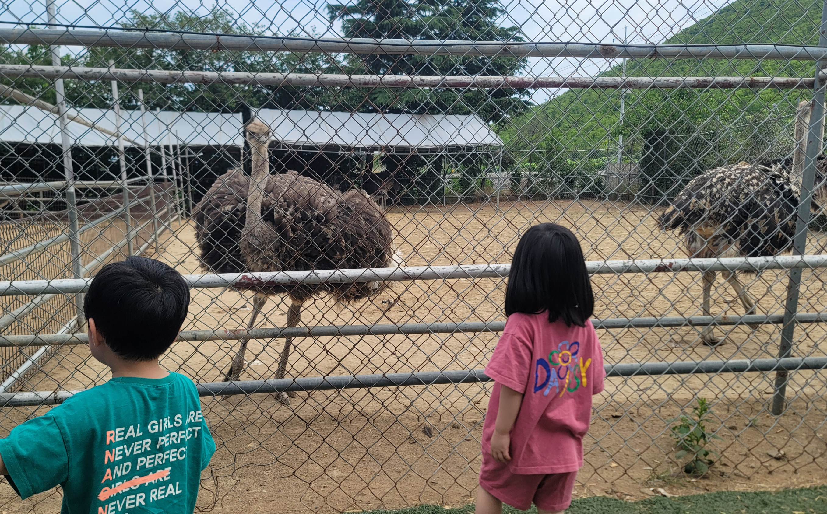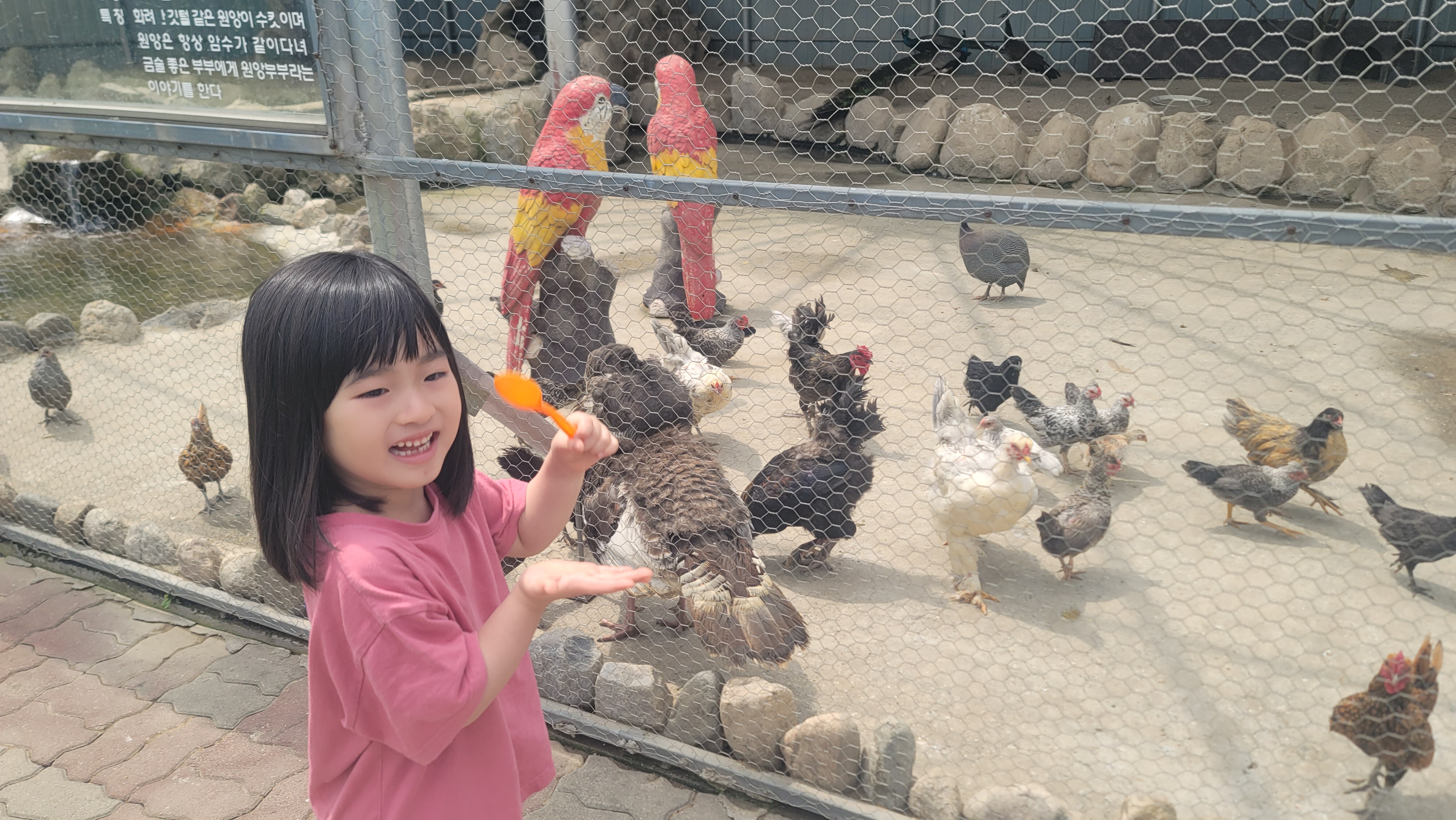 매표소를 지나자마자 넓은 잔디밭이 반겨줍니다. 동물에 집중하지 못하는 친구들도 맘껏 뛰어놀 수 있어 좋을 것 같습니다. 먼저 색깔과 종류가 다양한 새들이 반겨줍니다. 먹이통과 숟가락을 주셔서 중간중간 먹이도 주었습니다.