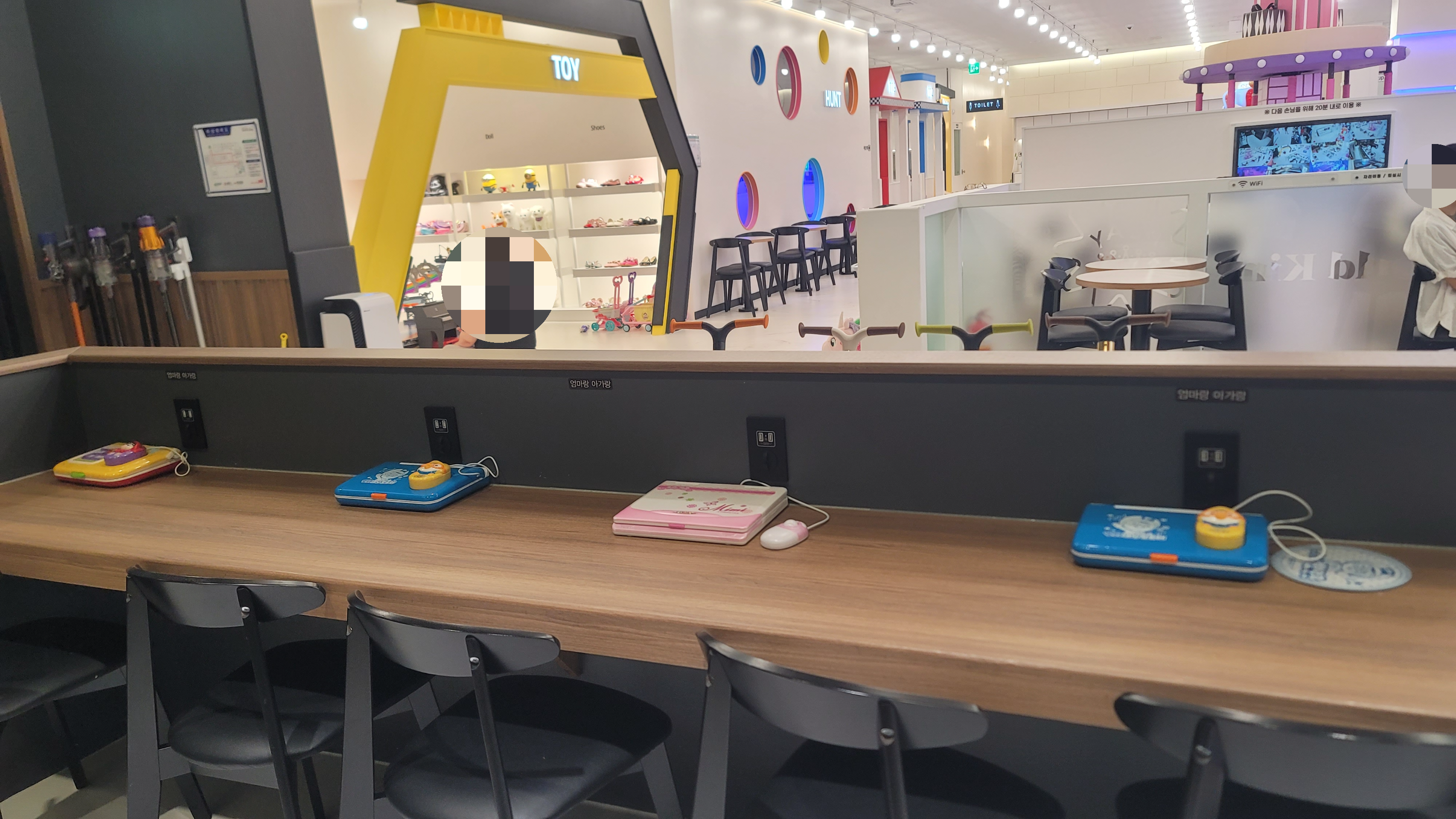 뒤에 테이블에도 장난감이 비치되어 있어요. 뽀로로 노트북 같은 장난감이 있어서 어린이들도 재밌게 놀 수 있습니다. 저희 아이도 관심 있어서 해보았는데 코딩 장난감 기능이 있더라고요