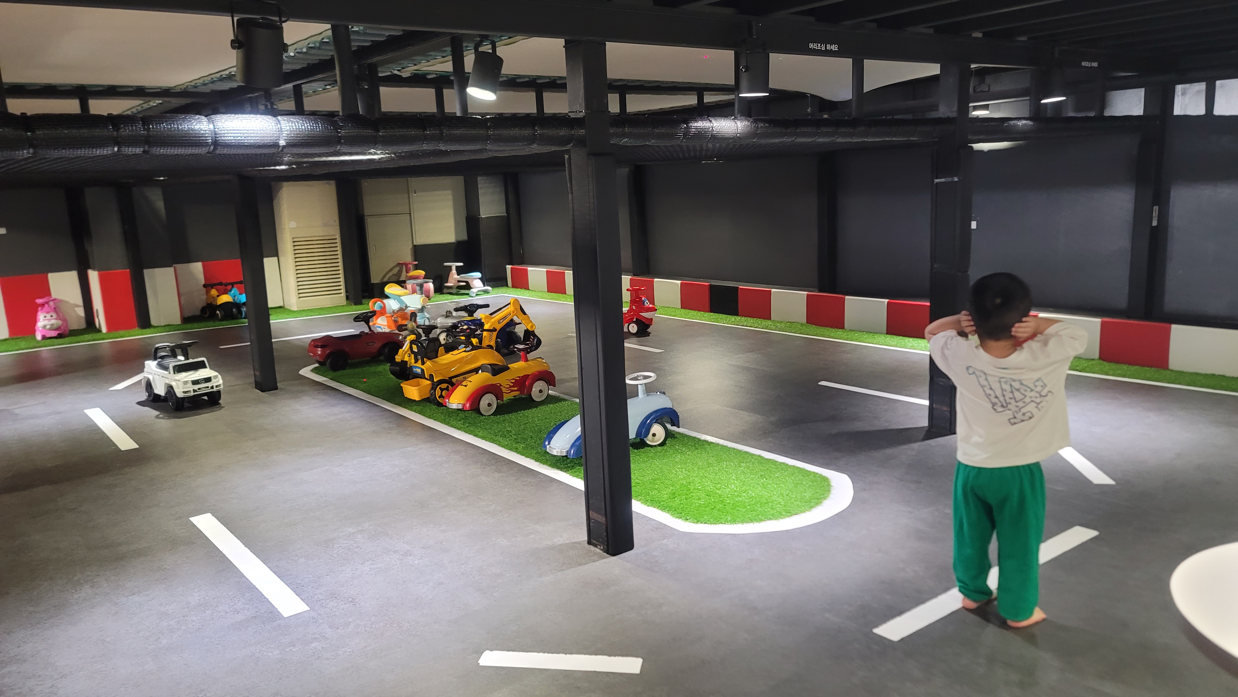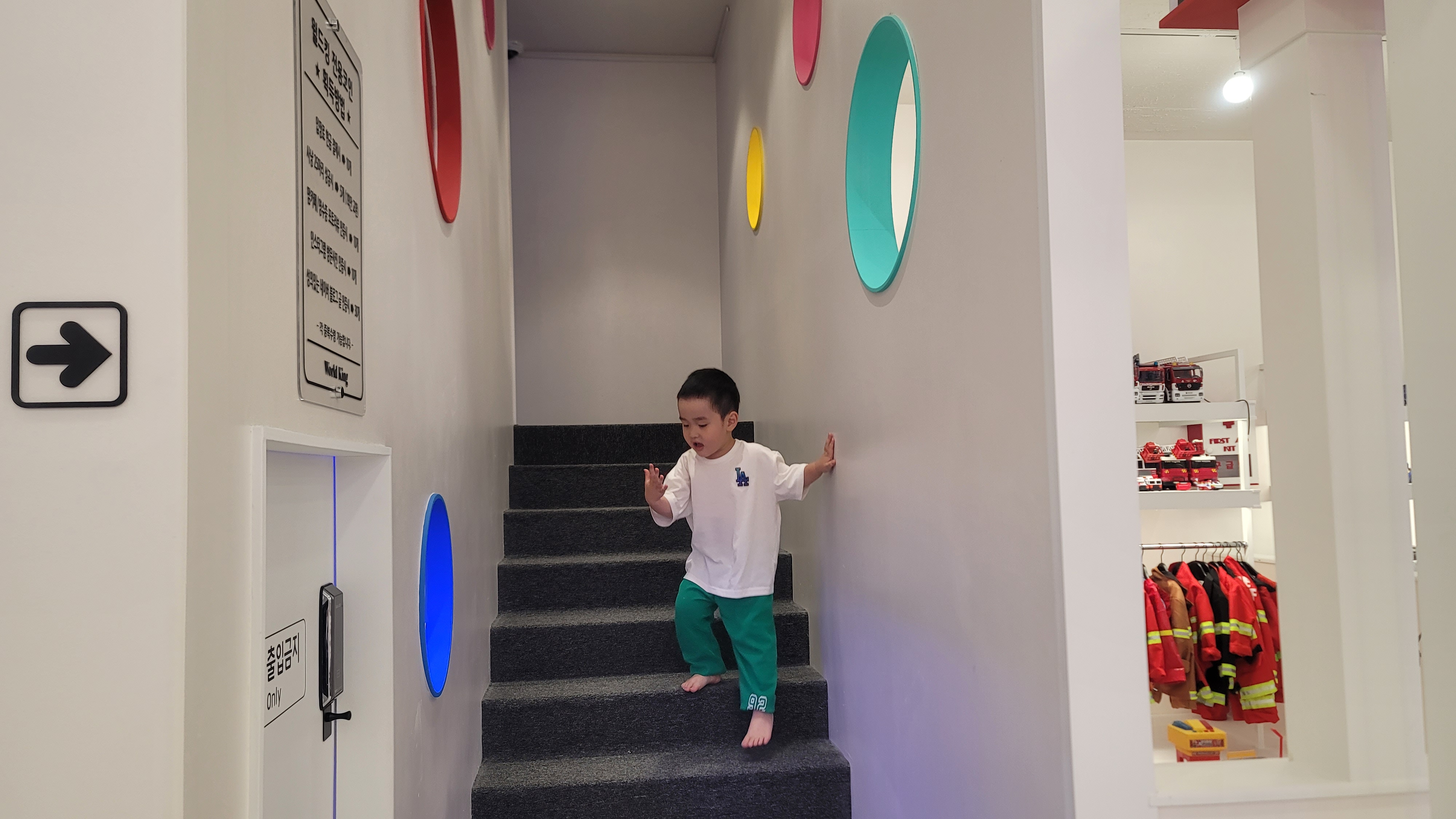 계단 옆쪽으로는 자동차 장난감들과 트랙이 구성되어 있습니다.