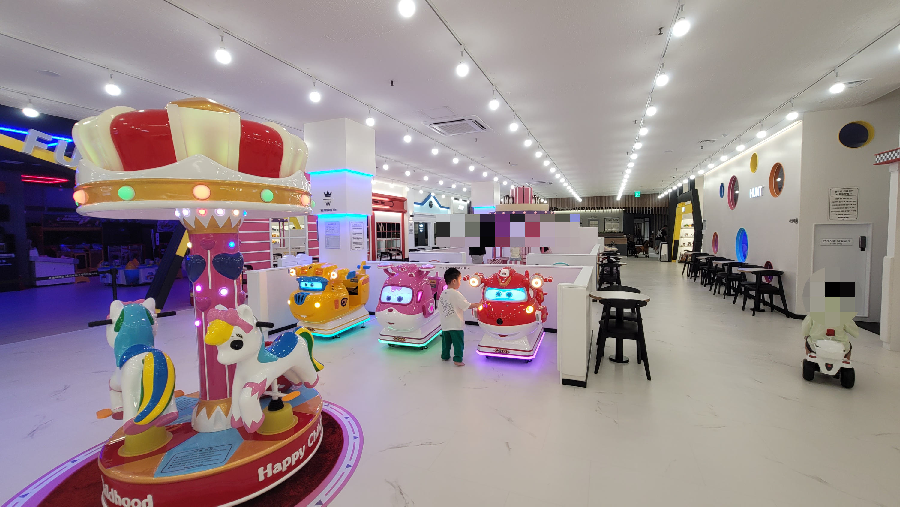 테이블과 의자는 통로 쪽 그리고 뒤편에 자리 잡고 있습니다. 회전목마 왼쪽으로는 오락실이 있어요. 저기는 코인으로 이용가능하고 11시부터 입장할 수 있는 공간이에요.