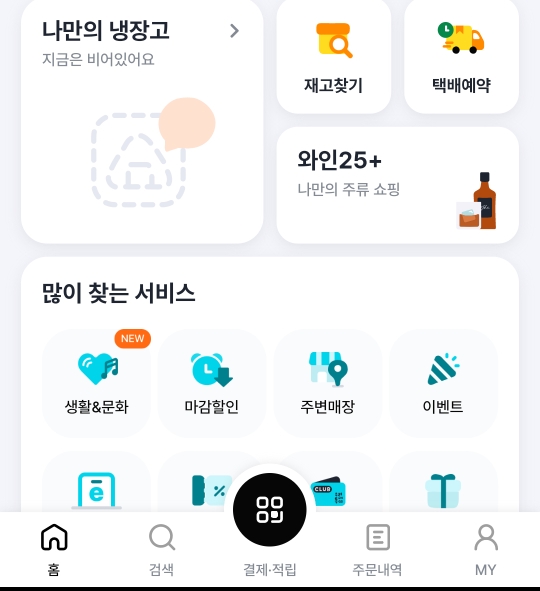 그리고 어플 아래 돋보기 모양인 검색을 클릭하여 냉면육수를 검색해주시고 재고가 있는지 없는지 확인해주시면 됩니다.