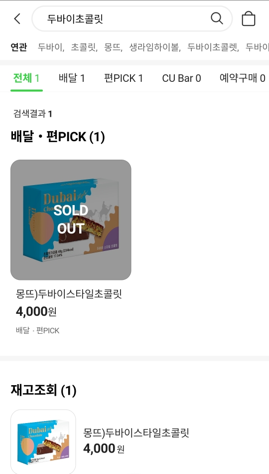 설치를 완료하고 두바이 초콜릿을 검색하였습니다. 편픽이나 배달은 솔드아웃으로 품절된 상황이었고 아래 재고조회가 있습니다.