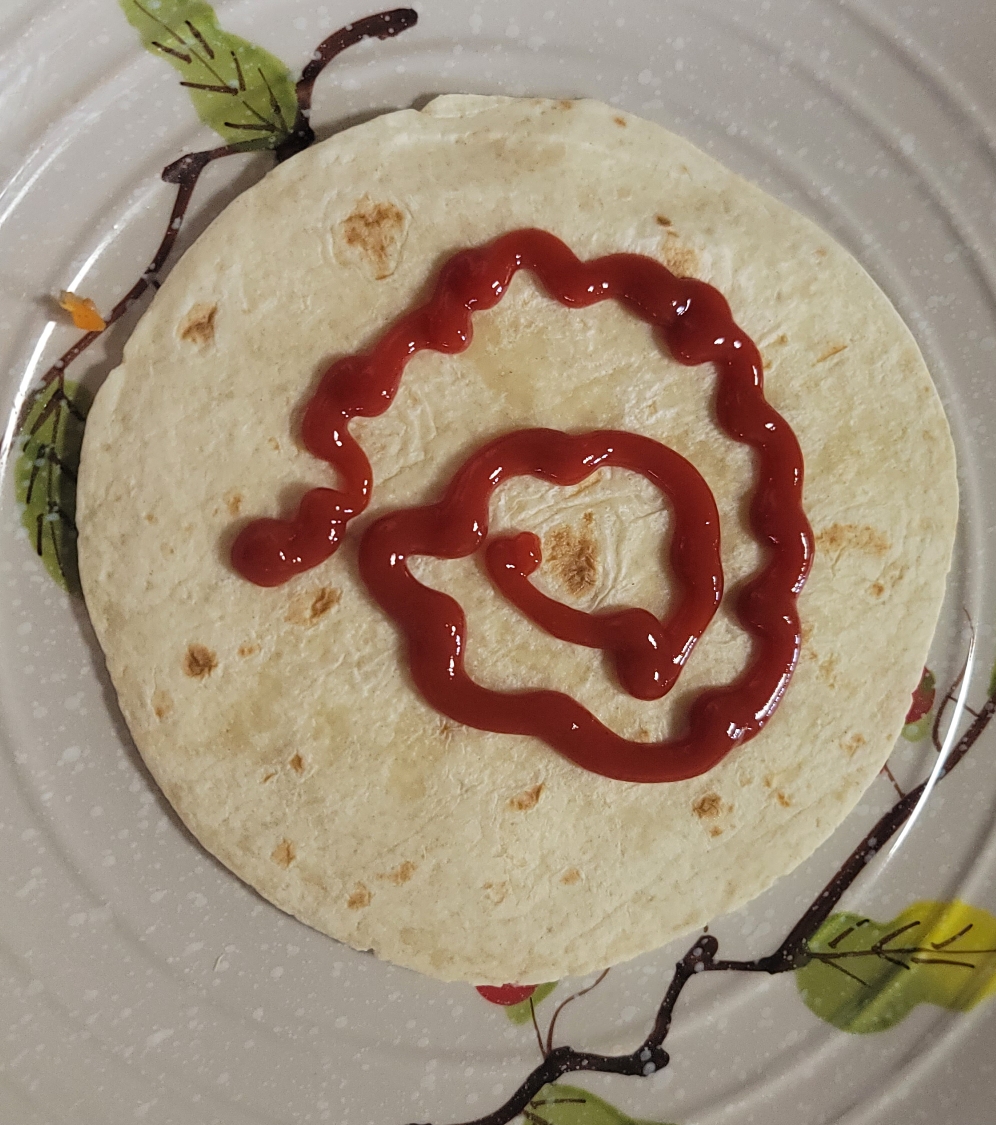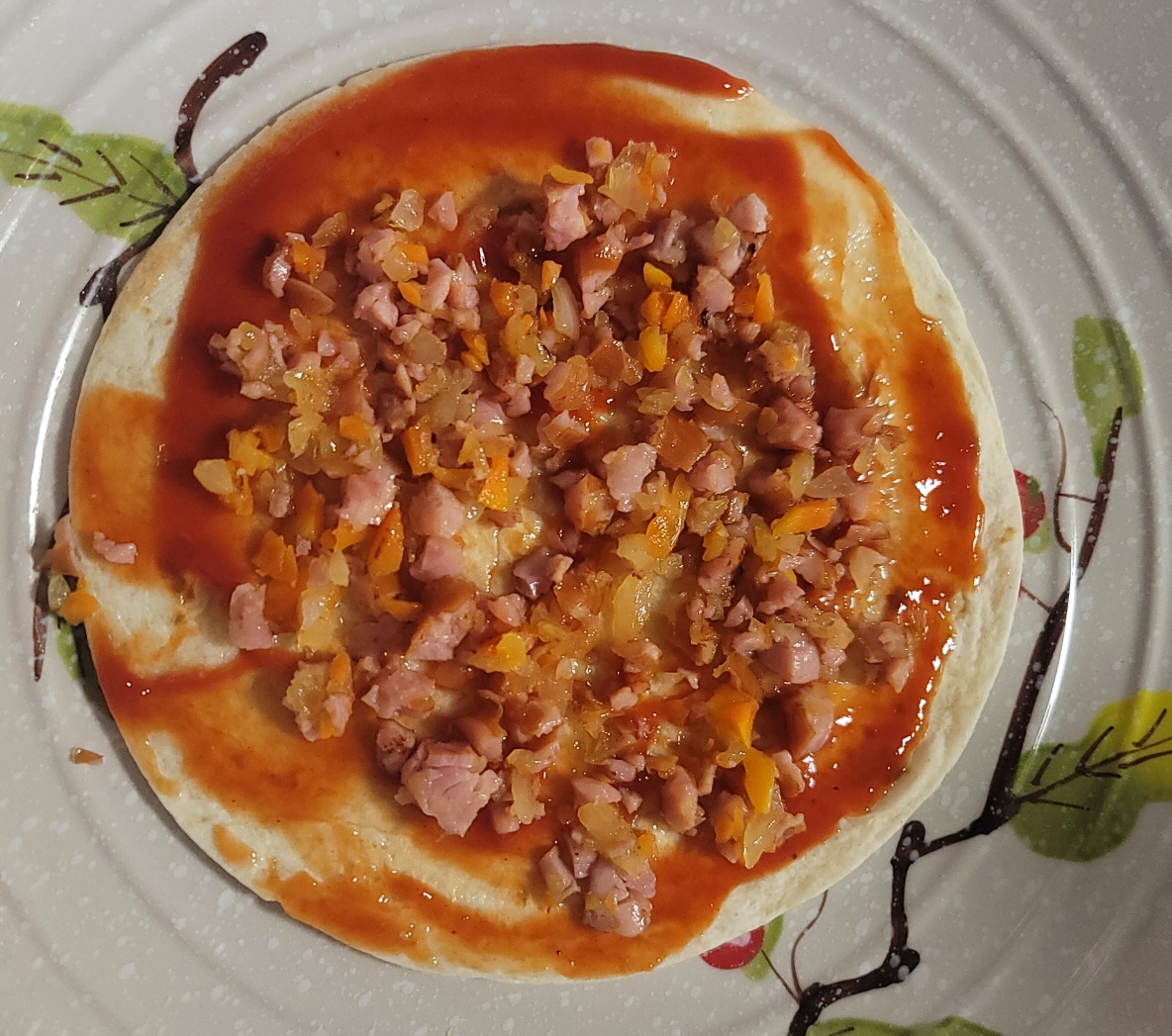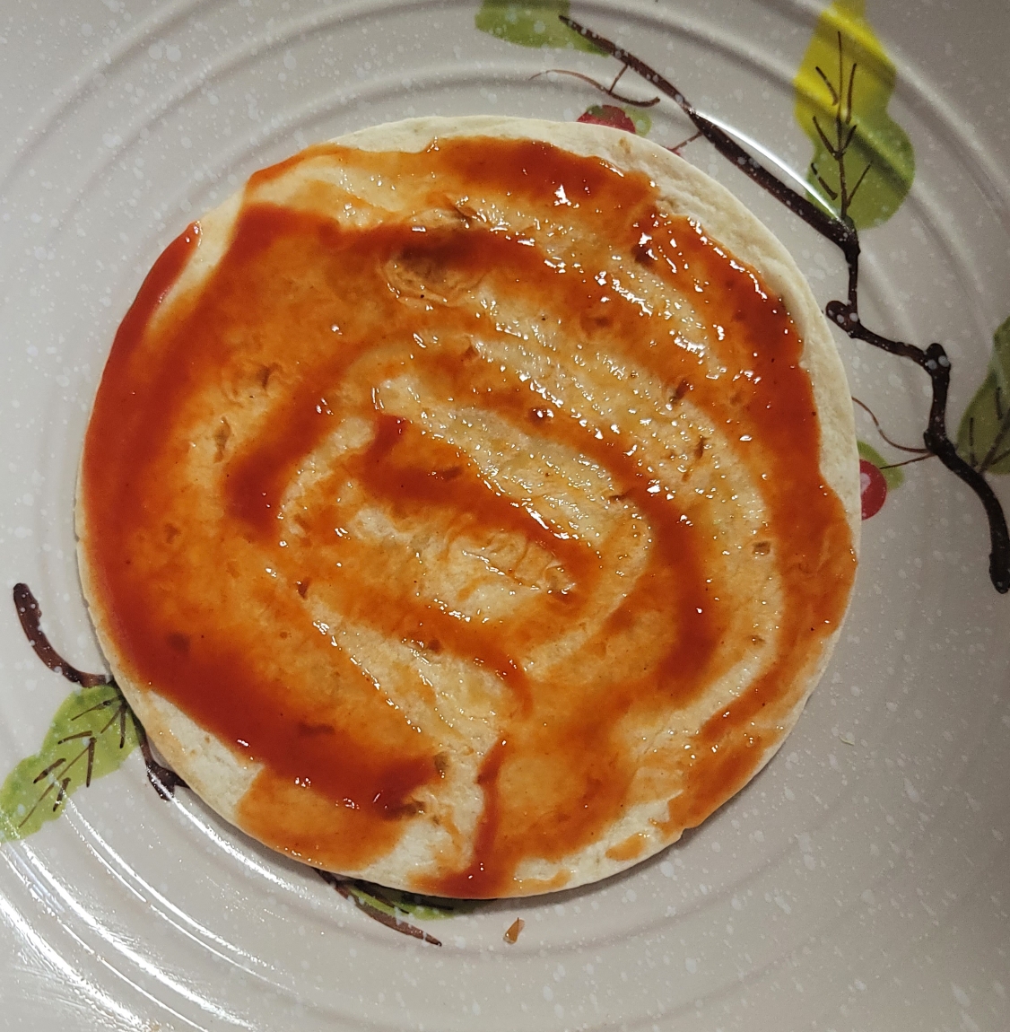 먼저 야채와 햄을 잘게 다져서 미리 볶아주었어요. 이것만 준비되면 거의 완성이나 다름없습니다. 준비하신 재료를 볶아주셨다면 또띠아를 접시에 올려놓고 케찹을 뿌려 펼쳐주세요.
