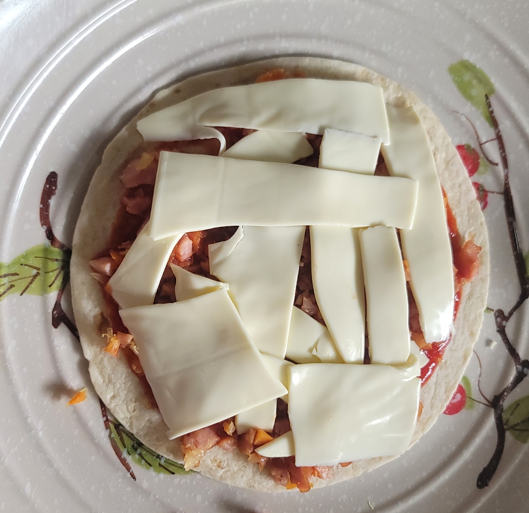 그리고 볶은 야채와 햄을 올려주고 치즈도 한장 찢어서 올려주세요. 저는 에어프라이어로 180도 설정 후 5분 돌려주었어요. 또띠아도 바삭바삭하고 맛도 괜찮더라고요. 그런데 치즈가 생각보다 양이 적어보이더라고요