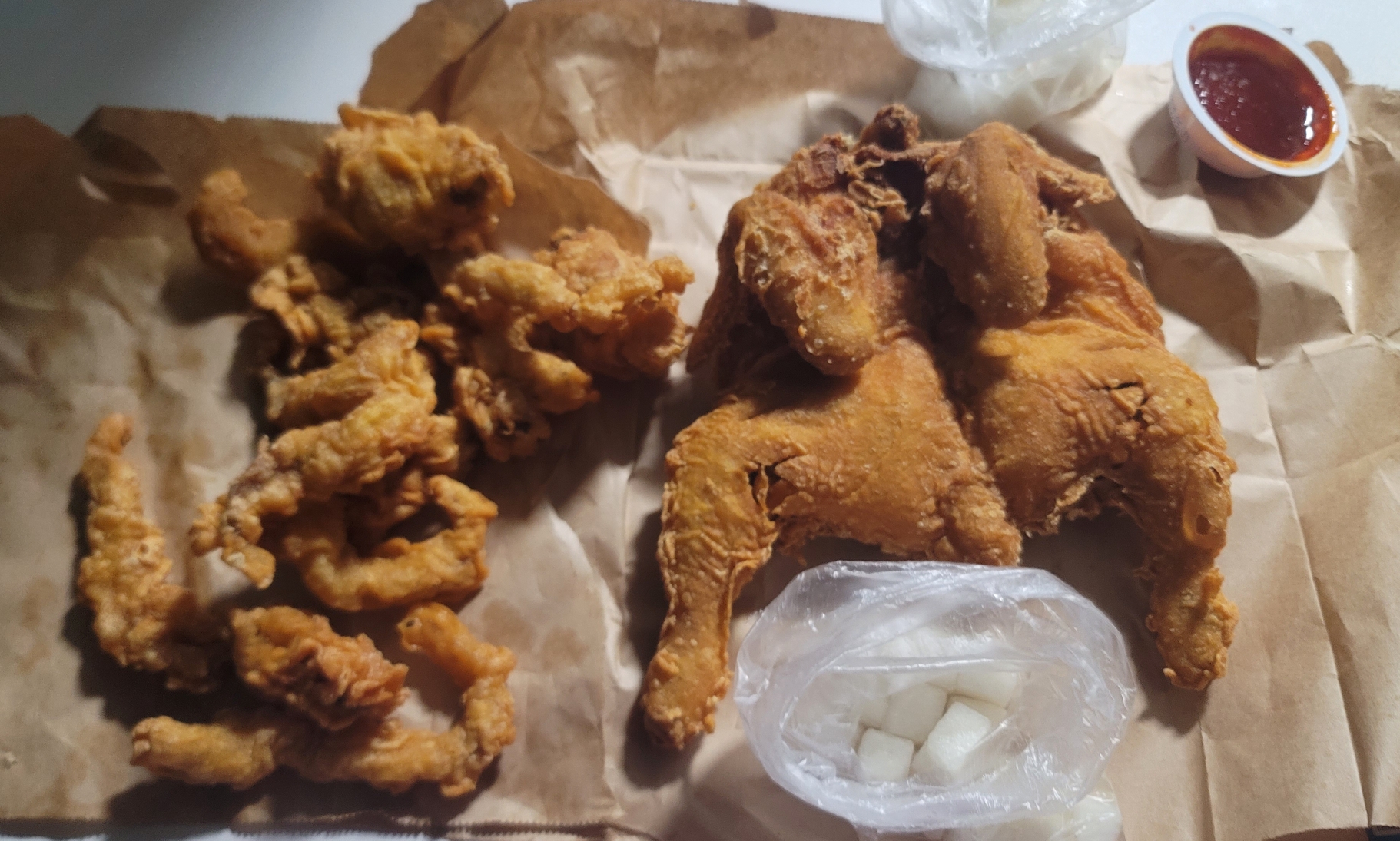 20분안에 포장이 되었어요. 정말 빠른 것 같아요! 치킨무 두개와 소금이 같이 오고 치킨양념 하나는 따로 주문했어요. 옛날통닭 한마리도 만원이고 닭똥집과 닭목살튀김도 만원이에요! 치킨양념 소스는 500원에 구매했습니다.
