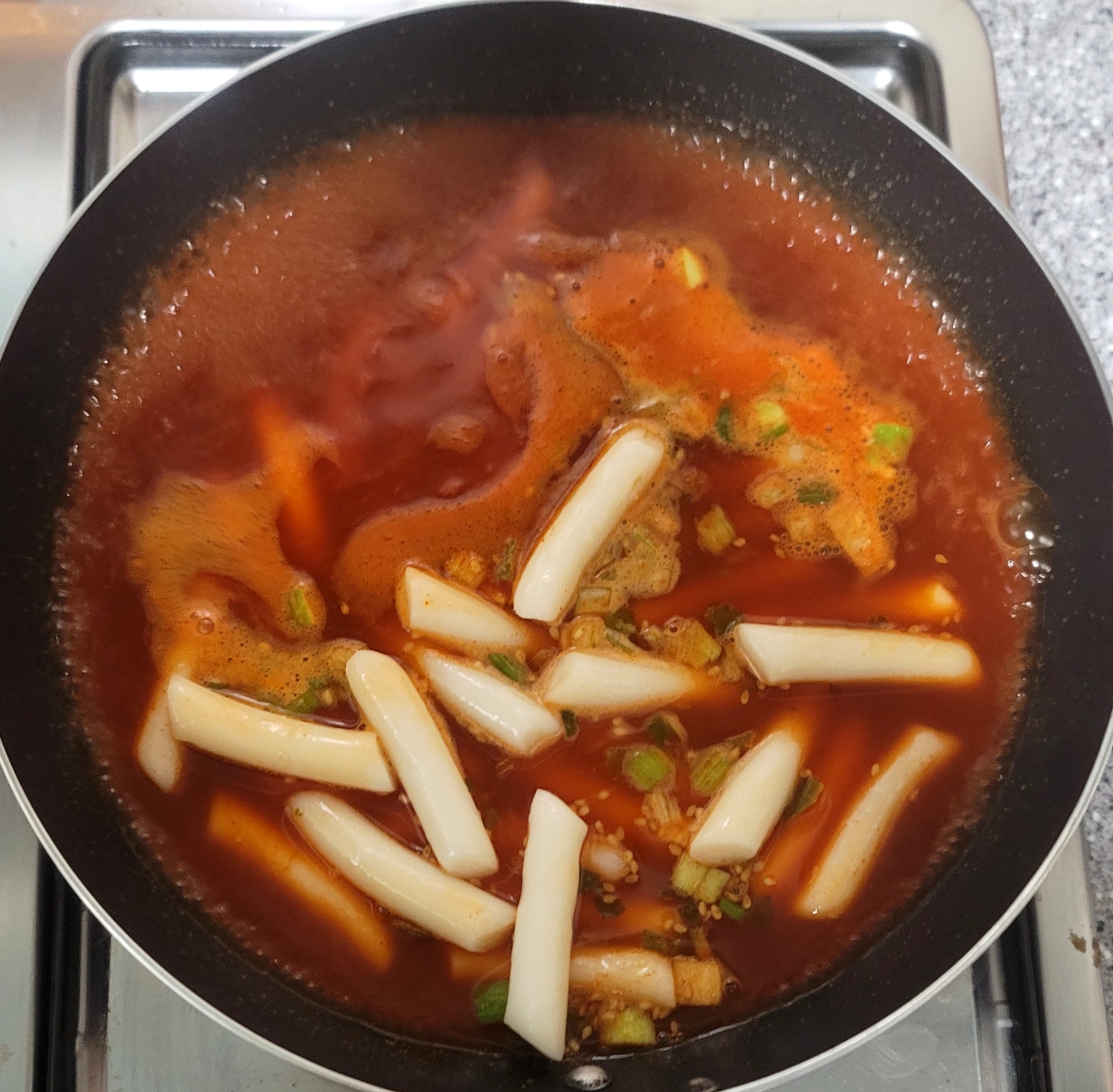 소스가 끓기 시작하면 떡볶이떡을 넣고 5분간 끓여줍니다 눌러붙지 않도록 계속 저어주었어요