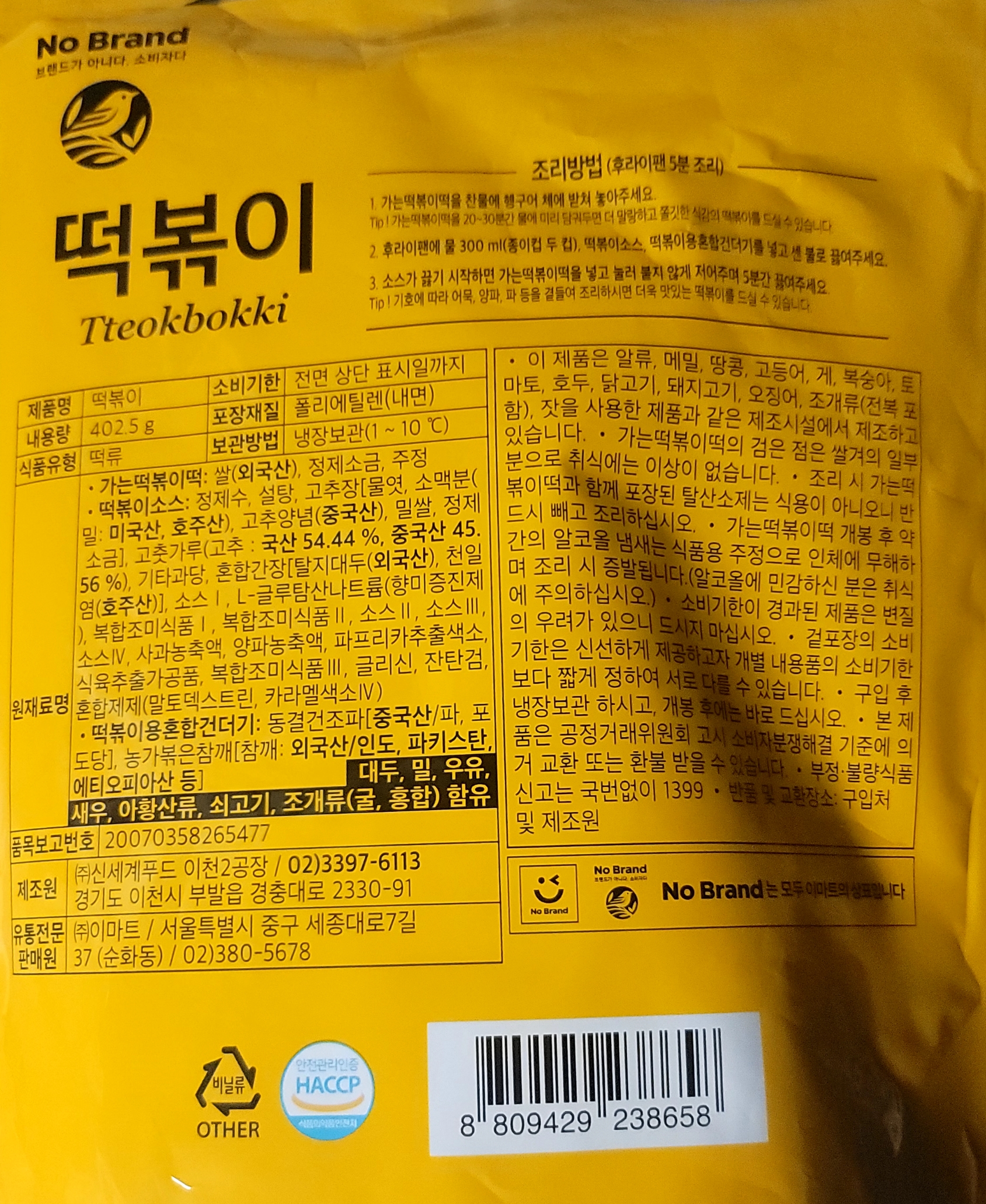 한 봉지에 2인분이에요 가끔 체인점 떡볶이가 아닌 분식집 떡볶이가 생각날 때 있잖아요 전면에 #분식 #간식 해시태그를 보고 맛을 상상하게 되더라고요 구성은 떡과 떡볶이소스 그리고 떡볶이용 혼합건더기가 들어있어요