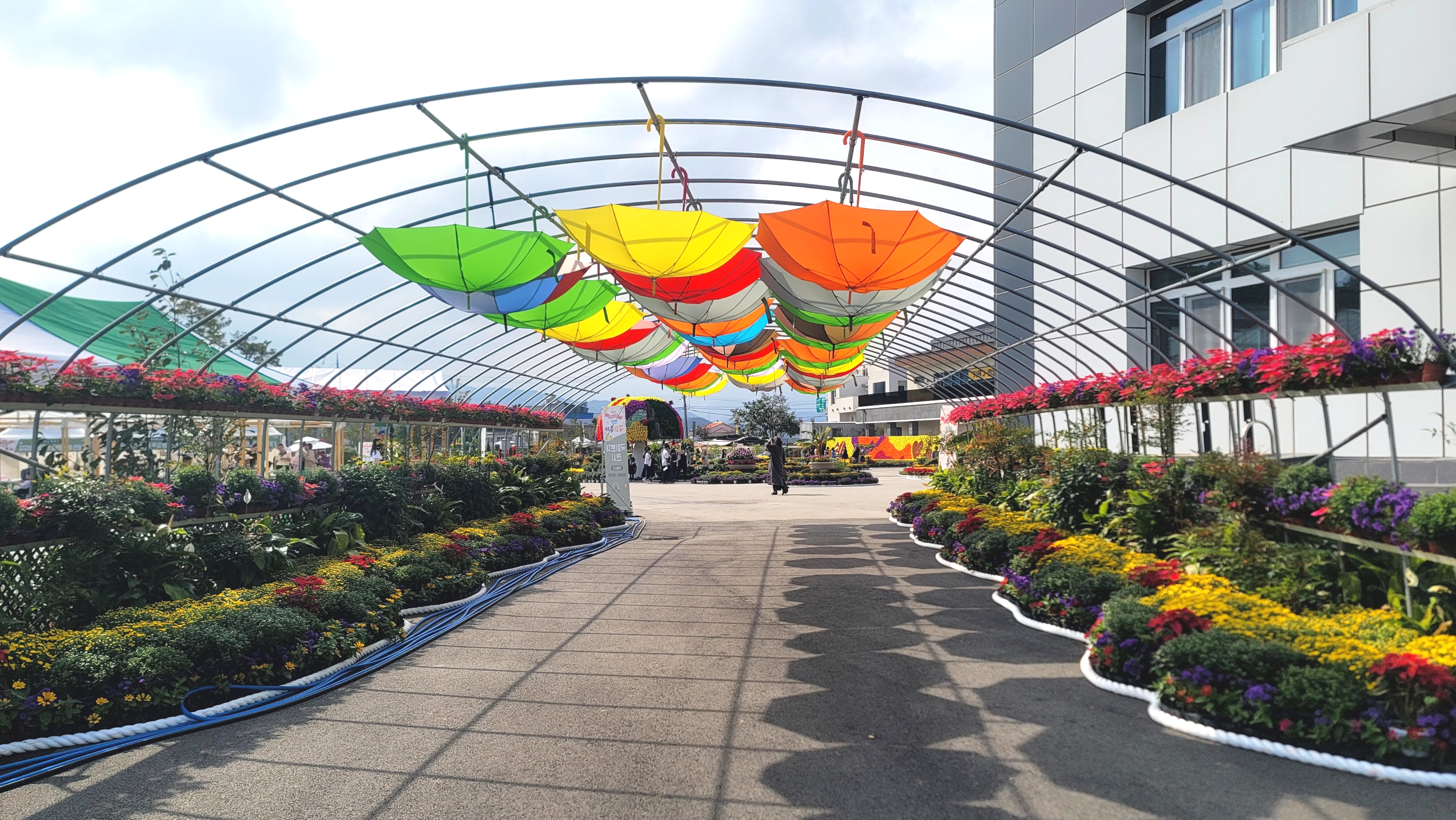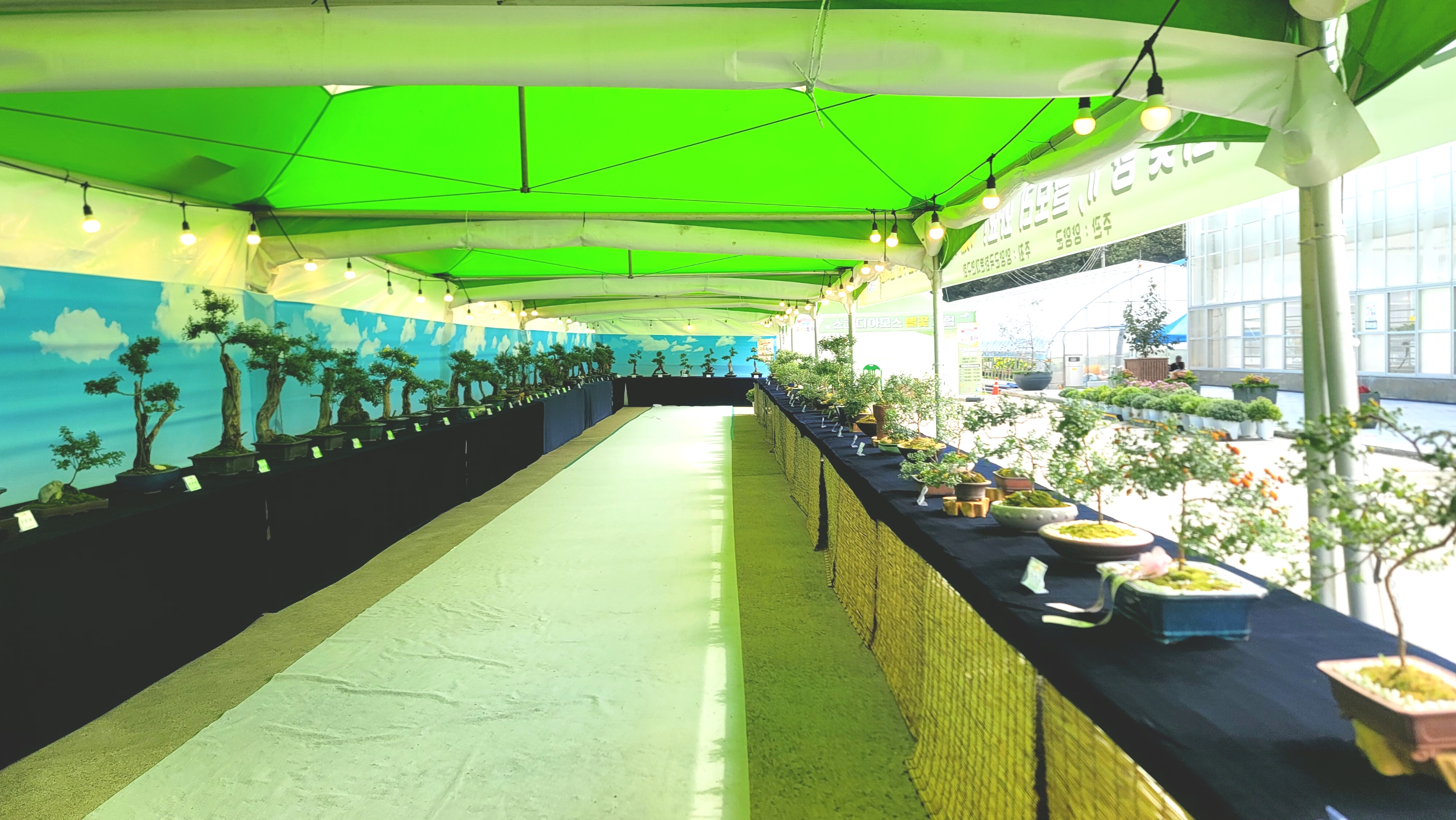 분재 구경가요 가는길은 우산으로 꾸며져 있고 부스가 길게 배치되어있습니다