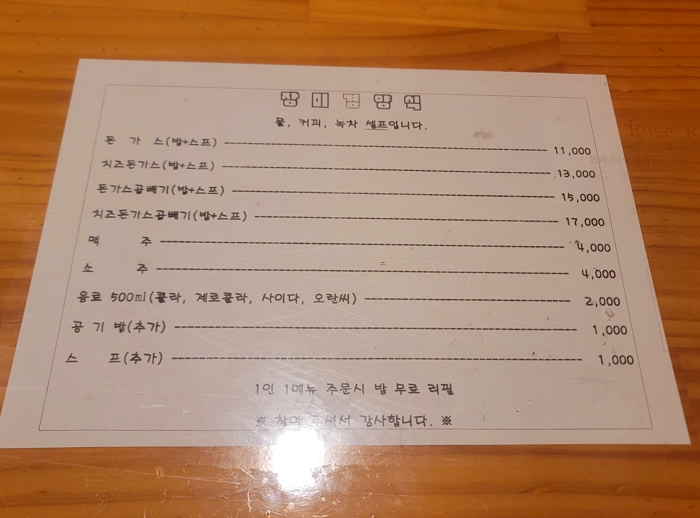 장미경양식 메뉴판이에요 테이블위에 부착되어있어요